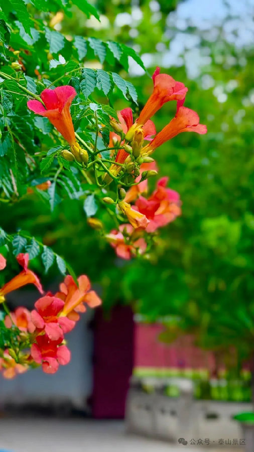 漫步岱庙,不经意间便会被那橙红色的小喇叭吸引。它们一簇簇、一团团地簇拥着,在碧绿枝干的衬托下,愈发鲜艳夺目。红墙之上,凌霄花肆意攀爬,如灵动的画笔,勾勒出自然的诗意;庭院之中,它们探出身来,似在与游人私语。