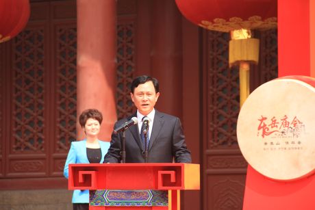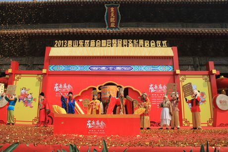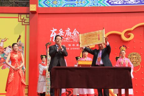 4月24日上午,2013年泰山东岳庙会暨中韩民俗文化周、台湾信众泰山行启会仪式在岱庙天贶殿大露台隆重举行,市委常委、副市长刘卫东,市人大常委会副主任孙运飞,市政协副主席、市总工会主席张书盈,泰山景区党工委书记谭业刚,泰山景区管委会主任李际山,市政府副秘书长张耀,市政府台湾事务办公室主任刘卫东及市直有关部门单位负责同志、景区领导班子成员出席启会仪式,中国民俗学会会长、中国社会科学院民族文学研究所所长、联合国教科文组织非物质文化遗产专家朝戈金,中国民俗学会副会长兼秘书长、中国社会科学院世界宗教研究所研究员、博士生导师叶涛,韩国东海市三和寺信徒协会会长金莹钦,韩国东海市东方大学院大学校教授洪闰植,韩国东海市政府市长代表郑然在,韩国东海市韩中大学校传统文化学部长教授金京南,台湾善化东岳殿主委尤耿村,台湾高雄龙后宫宫主张顺后,北京民俗博物馆副馆长关昕,青岛高丽旅游度假有限公司总经理李红哲,山东省道教协会副会长、泰山碧霞祠主持张诚达等嘉宾、专家出席启会仪式相关活动。