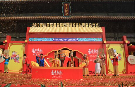 4月24日上午,2013年泰山东岳庙会暨中韩民俗文化周、台湾信众泰山行启会仪式在岱庙天贶殿大露台隆重举行,市委常委、副市长刘卫东,市人大常委会副主任孙运飞,市政协副主席、市总工会主席张书盈,泰山景区党工委书记谭业刚,泰山景区管委会主任李际山,市政府副秘书长张耀,市政府台湾事务办公室主任刘卫东及市直有关部门单位负责同志、景区领导班子成员出席启会仪式,中国民俗学会会长、中国社会科学院民族文学研究所所长、联合国教科文组织非物质文化遗产专家朝戈金,中国民俗学会副会长兼秘书长、中国社会科学院世界宗教研究所研究员、博士生导师叶涛,韩国东海市三和寺信徒协会会长金莹钦,韩国东海市东方大学院大学校教授洪闰植,韩国东海市政府市长代表郑然在,韩国东海市韩中大学校传统文化学部长教授金京南,台湾善化东岳殿主委尤耿村,台湾高雄龙后宫宫主张顺后,北京民俗博物馆副馆长关昕,青岛高丽旅游度假有限公司总经理李红哲,山东省道教协会副会长、泰山碧霞祠主持张诚达等嘉宾、专家出席启会仪式相关活动。