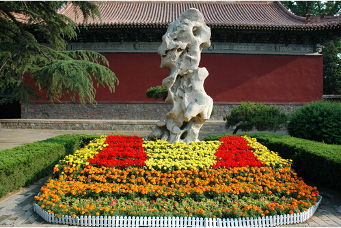 在南北城墙悬挂了龙旗、灯笼,同时进行院内外花卉组摆,做好节日氛围营造工作。