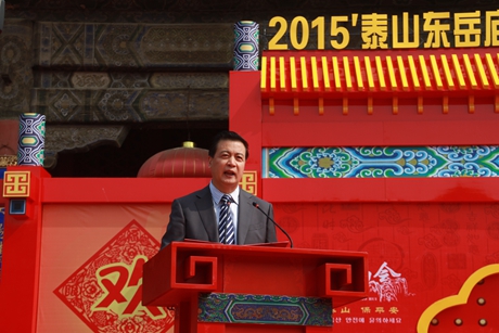 叶涛在致辞中说,泰山东岳庙会历史悠久,内容丰富,是我国最具有影响力的庙会。泰安市委、市政府对保护这一珍贵的非物质文化遗产高度重视,泰山管理部门对庙会的传承与发展采取了许多切实可行的措施。近年来,泰山庙会在继承传统的同时,还结合时代特点,逐年融入新的内容。将台湾民俗文化引入到泰山庙会之中,正是当今泰山庙会的一个亮点,也是两岸民俗文化交流积极有益的尝试。在今年的庙会上,还可以感受到民族风情,使泰山东岳庙会具有了更加广泛的代表性。我们热切希望,以泰山东岳庙会为代表的中国庙会文化,能够走出国门,早日列入联合国教科文组织的人类非物质文化遗产保护名录,让世界人民共享这一宝贵的人类文化遗产。