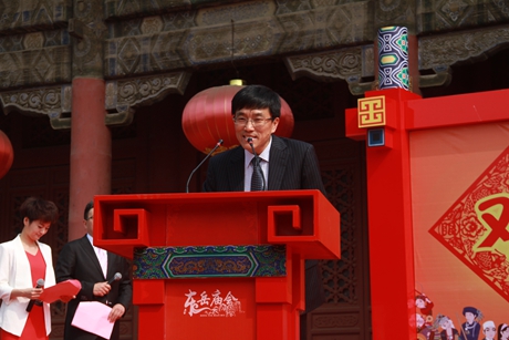 谭业刚在致辞中指出:泰山是“国泰民安”的象征,被誉为中华历史文化的缩影、中华民族的精神家园,也是首例世界文化与自然双遗产、世界地质公园、首批国家级风景名胜区、首批全国文明风景旅游区、首批国家5A级旅游景区。泰山文化博大精深、源远流长。作为国家级非物质文化遗产的泰山东岳庙会,是泰山最具生命活力的民俗文化景观和中国最具代表性的庙会之一。近年来,泰山景区在泰安市委、市政府正确领导下,高度重视泰山东岳庙会文化的保护、挖掘与传承,按照把泰山办成海峡两岸及国际具有特殊影响力的祈福圣地这一目标,以弘扬、展示泰山文化为核心,不断创新形式,提升品位,拓展领域,做强文化产品,做大文化产业,为打响“登泰山 保平安”品牌注入了新的元素和内涵。同时,通过泰山东岳庙会的连续成功举办,搭建了泰山、泰安与台湾地区互信共赢的“国家级海峡两岸交流基地”这一高规格平台;通过泰山东岳庙会这个纽带,有力促进了泰山、泰安与韩国的国际间交流与合作。本届庙会以“逛东岳庙会 祈平安福贵”为主题,在挖掘提升往届特色项目的基础上,引入华夏各民族“和合共生”的主旋律,突出海峡两岸文化交流及中韩之间旅游商贸合作,策划组织开展非物质文化展示、民族美食节、民族歌舞表演、民族商品展销等12项特色文化、旅游、经贸活动。我们也诚恳希望以此为契机,推进泰山文化的传播、泰山精神的弘扬和宝贵非物质文化遗产的永续传承利用,在更深层次、更广领域开辟海峡两岸、中韩两国合作交流的新格局。