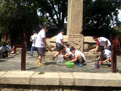 近日,按照景区团工委部署,结合泰山景区创建全国文明城市暨国家卫生城市复审的活动安排,博物馆与驻地周边学校开展共建活动,组织泰安市实验小学的学生到岱庙进行义务劳动,对岱庙西侧主干道的砖缝杂草进行清理。