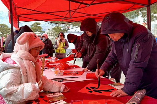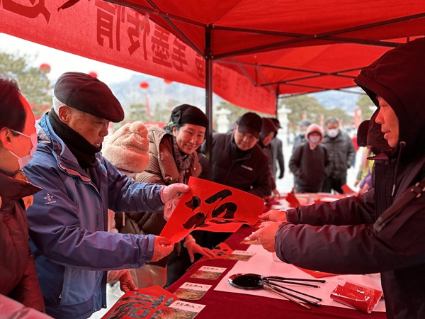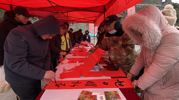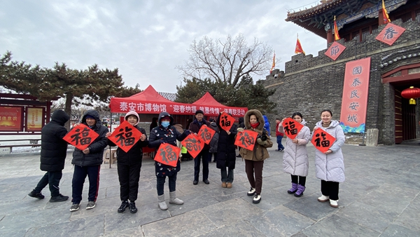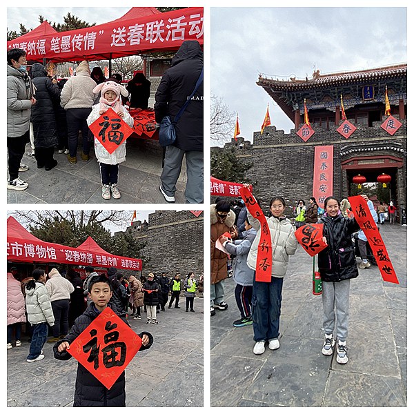 2月2日上午,博物馆在岱庙北门外举行了“迎春纳福 笔墨传情”送春联活动,在大红的对联和福字的点缀下,热闹的场景和游客市民欢快的笑颜,为即将到来的春节增添了浓厚的喜庆氛围。