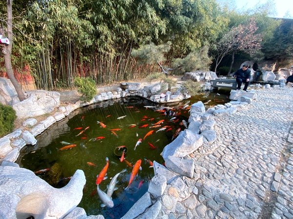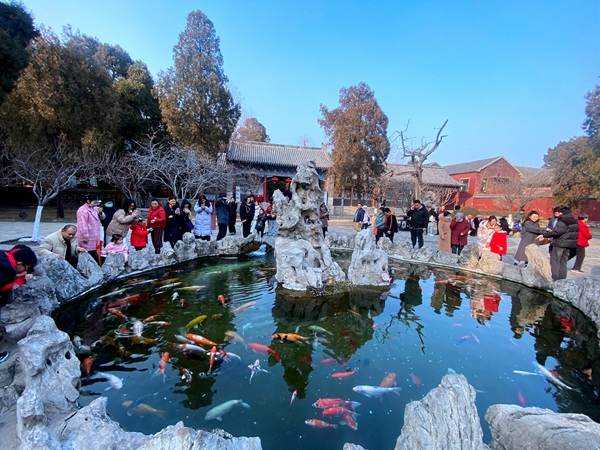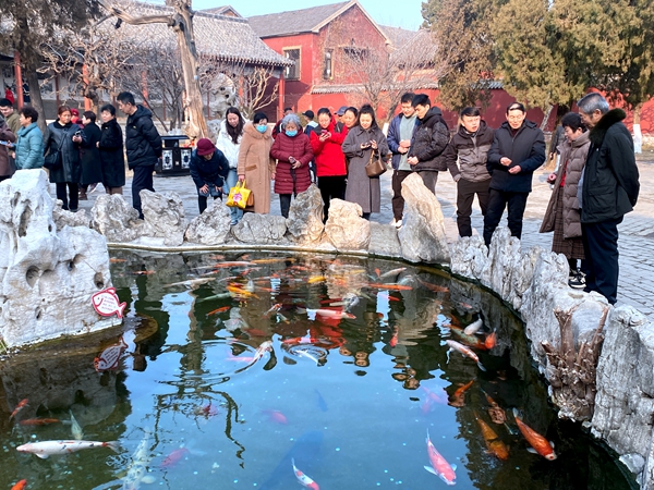 锦鲤自古就被赋予富贵吉祥、健康长寿、幸运繁荣的美好寓意。春节期间,岱庙西花园、仁安门、唐槐院、汉柏院的六处鱼池吸引了众多游客驻足。五彩锦鲤仪态优雅,在水中结队畅游,给游客以赏心悦目的感官享受,去岱庙“赏锦鲤”成为春节岱庙游客的必选项目。