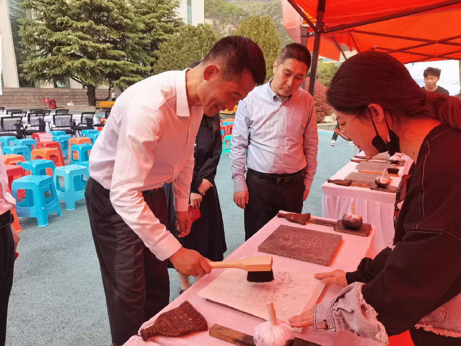 学校领导、师生共同参与“碑刻拓印”非遗体验。从宣纸润湿、捶拓上墨到成品揭取,师生们认真跟随专业人员的指导,亲手制作岱庙珍贵碑刻拓片,近距离感受传统非遗的精妙。现场气氛热烈,不少学生表示这是他们第一次近距离接触这一非遗技艺,深刻感受到了传统文化的独特魅力。