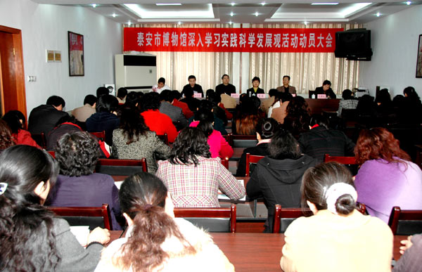 3月17日,博物馆深入学习实践科学发展观活动动员大会隆重召开,景区党工委副书记李锋同志、督导员萧诚同志出席会议,会上首先传达了景区党工委书记谭业刚同志在“景区深入学习实践科学发展观”动员大会上的讲话精神。馆长柳建新同志就开展学习实践科学发展观活动进行全面部署和动员。景区党工委副书记李锋同志就如何开展好教育活动提出了具体要求。会议的召开标志博物馆开展深入学习实践科学发展观活动正式启动。