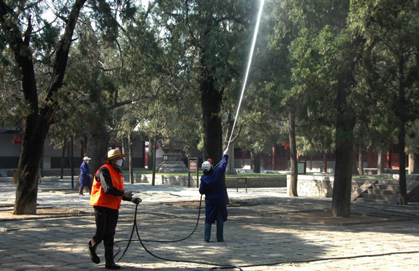 岱庙工作人员日前对景区内所有树木进行体检并实施春季打药,预防蚜虫等病虫害。