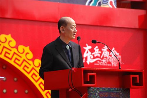 启会仪式上,泰安市副市长徐恩虎宣布2016泰山东岳庙会启会,泰山景区管委会主任姚霆、中国民俗学会副会长刘德龙、国际亚细亚民俗学会韩国会长金京南、中国国民党中央评议委员王素惠分别致辞。