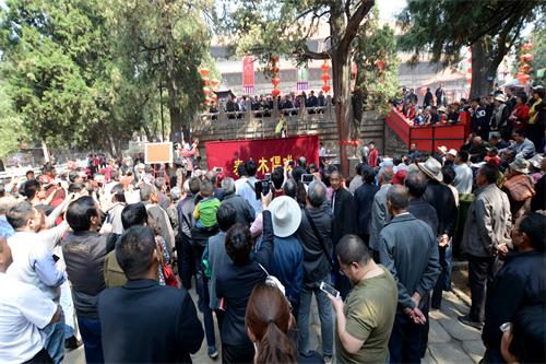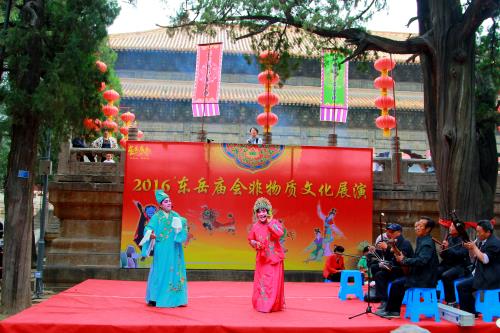 在天贶殿大露台西侧,道教音乐、宁阳木偶戏、舞狮舞龙特技、山东快书、变脸杂耍、汶河大鼓及拉魂腔等非物质文化遗产展演,吸引了不少市民和游客。