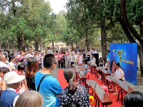 天贶殿西侧“古筝合奏”舞台前,孩子们缓缓划动细细的琴弦,优美的音符轻快的跳出,听众们也沉浸在优美动听的旋律中。