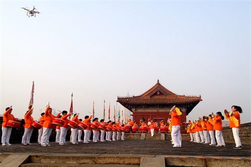 2017年1月1日,岱庙五凤楼上,由六十人组成的锣鼓队敲响了吉祥鼓,鼓声瞬间传遍四方,在这锣鼓喧天,震天动地的鼓声中,人们共同迎来了2017年的第一缕曙光。