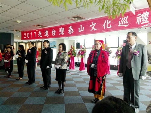 近日,“2017走进台湾--泰山文化系列巡展”在高雄85大楼隆重开幕。中国国民党中央评议委员王素惠、台湾文化产经交流促进会理事长张丽珍、中华张天师道统发展协会理事长彭天贵等贵宾以及来自台湾各地信众代表约300余人参加了开幕式。