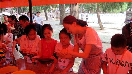 在岱庙阁老池东侧包粽子活动现场,孩子们认真学习,积极参与,亲自动手实践。大手牵小手,将传统文化传承下去。
