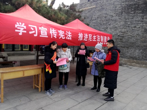 在岱庙北门广场,设立咨询台,悬挂宣传标语,制作了以宪法日的意义和宪法在我们日常生活中的影响等方面为内容的宣传页,并安排专人和志愿者一起发放相关法律法规资料,针对宪法相关知识向游客进行讲解。同时结合文明城市创建活动,发放创城明白纸,不断提高广大市民和游客对创城的知晓率、支持率和参与率,营造了浓厚的创城宣传氛围。提倡大家遵纪守法,文明出行,共同为泰安市创建文明城市的迎检工作奉献自己的力量。