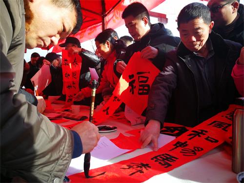 活动现场,书法家们挥毫泼墨,专心书写市民和游客挑选的春联内容。随着笔锋的或顿或扬,一幅幅寓意吉祥、充满喜庆的春联跃然纸上,浓浓的情意、真诚的祝福溢于字里行间。在不到两个小时的时间里,共免费送出对联400余幅。