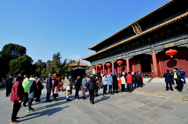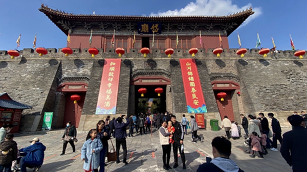 “山河锦绣国泰民安,和顺致祥幸福美满”。岱庙正阳门前醒目而又吉祥的大型牌匾,寄托了对新年的美好希冀和生活幸福美满的祝愿。城墙上飘扬的五彩龙旗,一字排开的大红灯笼,也为这个传统节日增添了浓浓的喜庆、祥和氛围。