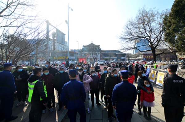 为做好春节期间的疫情防控工作,博物馆严格按照泰山景区疫情防控工作要求,全面落实疫情防控措施。今年岱庙景区首次实行“限量、预约、错峰”游览和南门进、北门出单向参观方式,岱庙景区执行最大承载量的75%,每日游客接待量不超过2.25万人,每两小时为一时段,每个时段预约上限为5625人,错过预约时段须重新预约。针对新要求,博物馆提前谋划,统筹安排,在官网和微信上发布公告,提醒游客朋友须网上预约后才能入园参观。为重点把好健康查验关、体温监测关、应急处置关等关口,对二线职工进行美团门票APP扫码预约程序及防疫检疫工作培训,分为防疫检测、扫码指导、检验码三个小组全部充实到一线岗位。同时储备了充足的防护口罩、酒精等防疫物资,安排专人多次对院内环境进行消杀。在南北门及天贶殿前等重点部位增设护栏,引导游客有序参观。与市公安局、消防救援支队联合行动,增强安保力量,全力维护岱庙景区安全稳定,保障游客在岱庙度过一个平安、祥和、欢乐的假期。