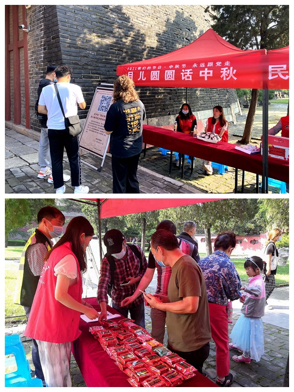 情满月圆、建言有“礼”活动同时开展,游客给岱庙景区提出一条合理化建议或扫二维码关注岱庙公众号,就会领到精美月饼一份。参与活动的游客在关注岱庙、为岱庙建言献策的同时,收到景区赠送的月饼“礼”,为其岱庙之旅增加了丝丝“甜蜜”。