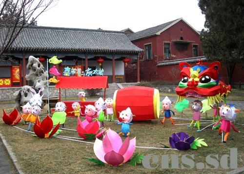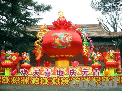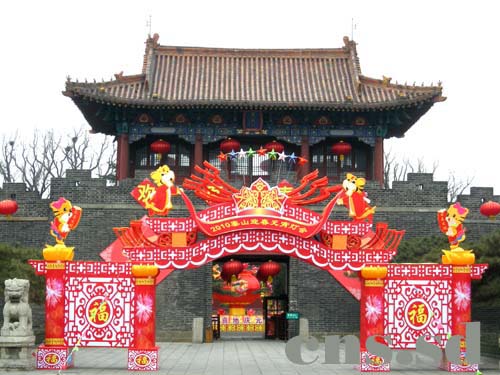 图为洋溢着吉祥气氛的花灯会门楼(摄影:贺安栋) 中新山东网泰安2月10日电 (孙弘 贺安栋)随着中国农历虎年春节的临近,世界自然与文化遗产泰山脚下的泰山岱庙张灯结彩洋溢着浓郁的节日气氛,笔者今天在泰山岱庙看到,26组大型迎春花灯已制作安装完毕,开始“亮灯”。 据了解, 本届泰山迎春元宵花灯会以“一样的年节,不一样的精彩”为主题,共投入资金100万元人民币。参展的花灯综合运用声、光、电等艺术手法,将泰山文化特色与传统灯会完美结合,力求营造出绚丽多彩的艺术效果。记者看到,正在做最后“亮灯”调试的26组花灯造型别致,做工精细,既有体现泰山地质奇观的艺术花灯——泰山彩石溪,又有反映传统民俗的大型景观灯——童子送福,还有深受小朋友喜爱的卡通灯,像十二生肖、白雪公主、喜羊羊和灰太狼等。本届泰山岱庙灯会将于2月14日(中国农历大年初一)正式亮灯,一直持续到2月28日中华民族传统的元宵节结束。