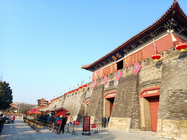 节日中的岱庙大红灯笼高悬、龙旗迎风飘展,突出地衬托出古朴与庄重,浓厚的文化底蕴伴随着喜庆的节日氛围,由内而外渗透洋溢出来,吸引着远近游客的目光。细心的游客可能会发现,南北门悬挂的“欢度元旦”喜庆标语的固定方式与以往有所不同。今年,经过多次尝试,一改以往粗犷固定标语的方式,在确保安全的前提下,采用了套箍城垛悬挂的设计形式,对城墙本体的保护精细到“拒绝任何一丝伤害”,既彰显了保护建筑本体的初心,也显示出与时俱进、精益求精的独到匠心。