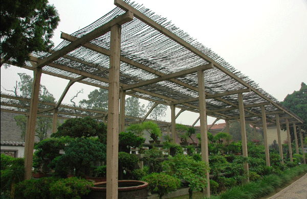 (维修前的东花园凉棚) 岱庙东花园凉棚建于上世纪70年代,立柱及横梁均为钢筋混凝土预制构件,由于年久失修,钢筋外露,腐蚀严重,混凝土大量脱落,大部分构件摇摇欲坠,失去承载力,给架下名贵盆景及过往游客带来极大的安全隐患。 8月,泰山管委规划局和博物馆的工作人员及时进行现场勘察,将其列入2009年管委重点维修项目,采取找投标方式,选择了有资质的施工队伍,实施了抢救性维修。