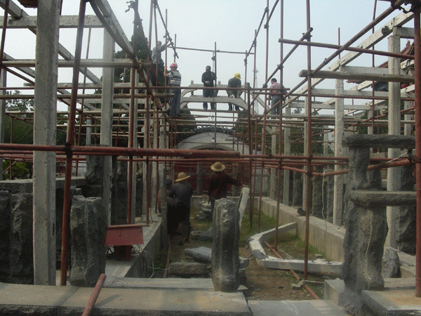 (维修中的东花园凉棚) 本工程拆除了原破损的构件,重新制作仿木混凝土构件,梁外伸作仿古式出头;外刷仿木漆;在梁架下补加挂落;在柱下部外贴蘑菇石,既增加了空间层次感,使之与岱庙周边环境协调一致,也确保了建筑物的安全,与架下名贵花卉一起,成为东花园一个崭新的美丽景观。 (供稿:赵祥明 编辑:董丹丹) |