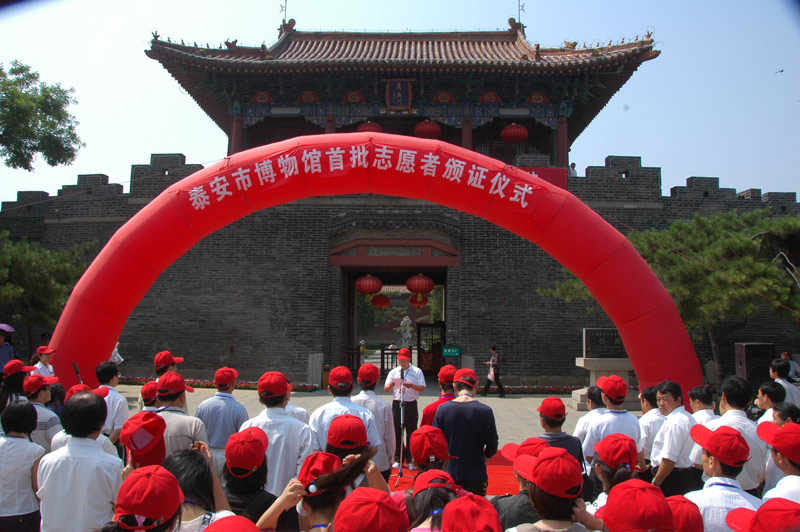 6月12日是我国第五个文化遗产日,当天上午10时,泰安市博物馆在岱庙厚载门举行了博物馆首批志愿者颁证仪式,100名社会志愿者领到了证书。同时,以“文化遗产,在我身边”为主题的宣传活动也如期进行。