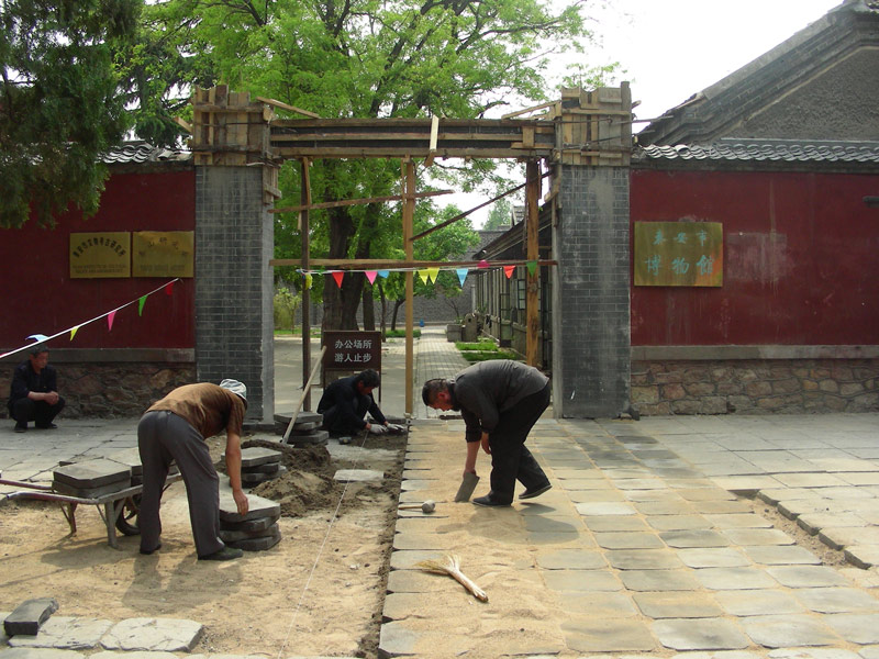 此次维修改造工程主要是将原有现代化的铁大门拆除,在原有青砖垛的基础上,经过加固,改造成传统的古建垂花门样式,拆除大门两侧的废弃砖垛,补做腰线石和虎皮石墙,院墙顶部补加青瓦顶,与原有院墙相统一,大门外地面进行整平,铺大方砖,垂花门下铺石条。