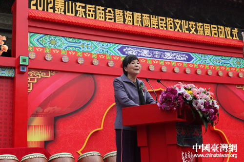 中国台湾网4月2日泰安消息 4月2日上午9时,由山东省泰安市人民政府主办,泰山风景名胜区管理委员会、泰安市人民政府台湾事务办公室承办的“2012泰山东岳庙会暨海峡两岸民俗文化交流周”启会仪式在山东泰安举行。中国国民党中央评议委员会主席团主席叶金凤出席大会并致辞。