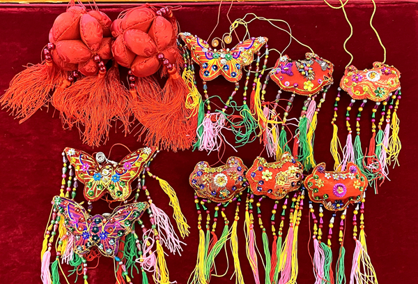 佩戴香囊、包粽子是端午节的传统习俗。大人小孩将颜色各异、形状不同的香囊佩戴于身上、腰间,以此来表达去五毒、辟邪祟的美好祝愿。而包粽子是为了纪念屈原,更是家喻户晓。