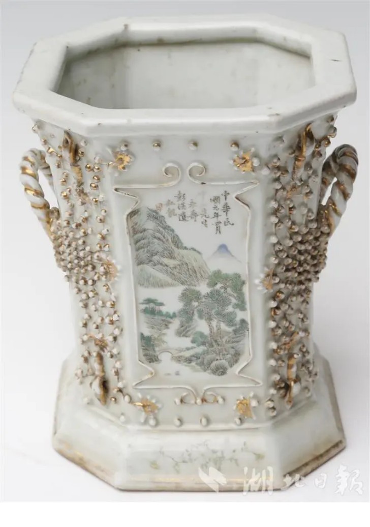 图为:彭汉遗赠孙中山粉彩开光山水人物图索耳花盆(一级文物)