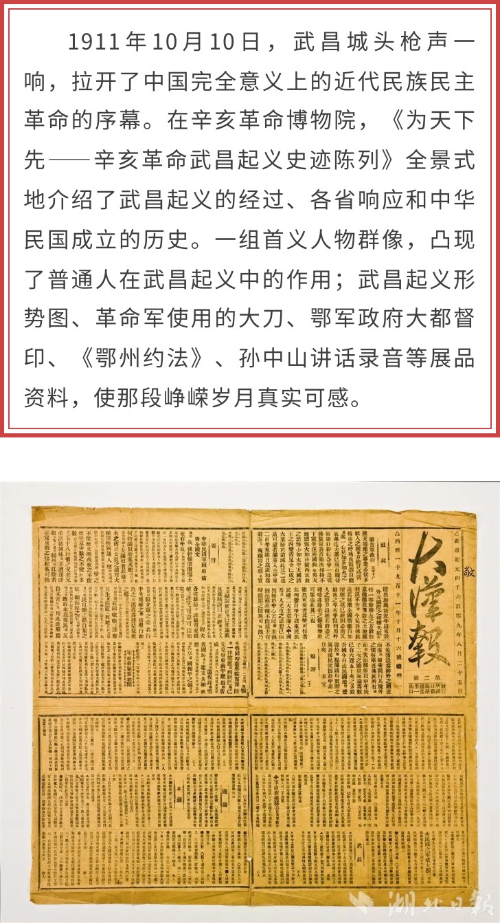 历史风云留下铿锵回响,如今,在武汉三镇有40余处辛亥革命旧址、遗迹、纪念设施展,如同一部立体的辛亥首义史,带我们感受首义之城的荣光。尤其是汉口有中山大道,武昌有中山路,一座城市中还有三座孙中山广场雕像,在全国并不多见。
