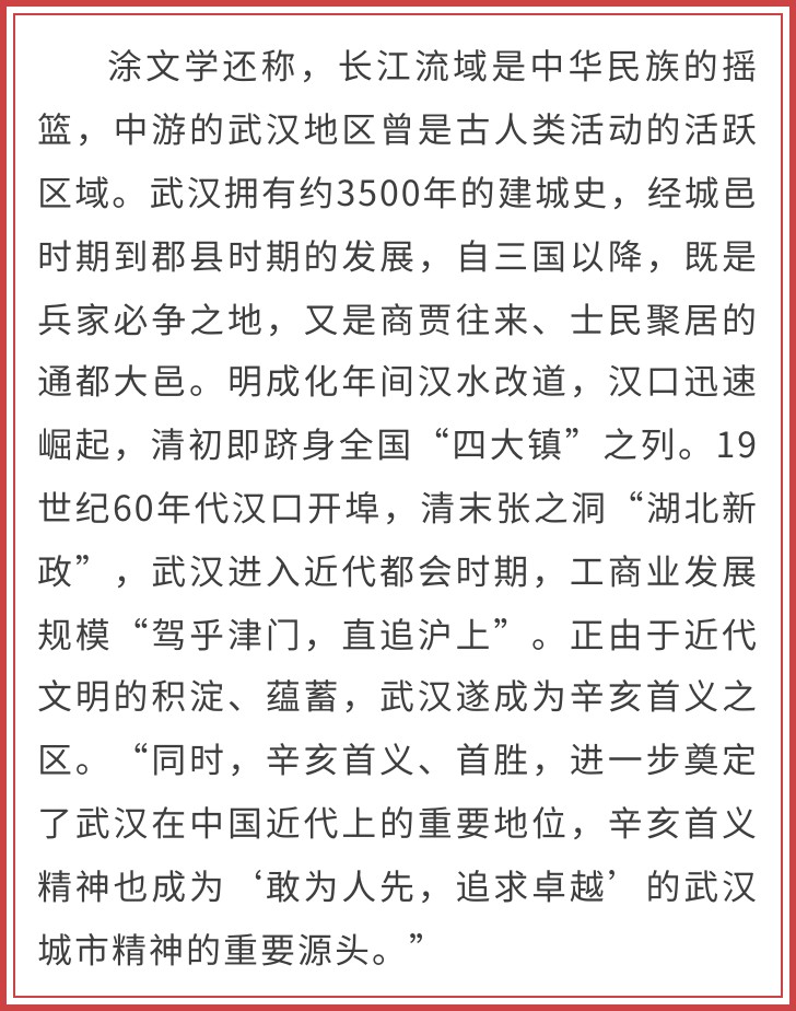 江汉大学城市研究院院长涂文学教授曾对“辛亥革命为什么在武汉首义和首胜”做过专题研究。他称,首先,武汉具备了城市革命所需要的相应的背景,作为资产阶级革命必须具有较为发达的近代工商业、较为发达近代教育文化事业、较为成熟的市民阶层。具体而言,当时的武汉,作为对外开放和洋务运动后起的城市,工业实力迅速跃居全国前列,工厂总数和某些经济指标曾一度超过上海。武汉是中国内陆最大的对外贸易口岸城市。武汉成为全国新式教育的中心和两湖地区的文化中心,是近代新思想的策源地,“文化湖北”“文化武汉”异军突起。其次,张之洞督鄂18年实施“湖北新政”,建工厂、兴教育、办市政、练新军,结果种豆得瓜,武汉因之成为推翻清王朝的“首义之城”。孙中山曾诙谐地称,“张之洞是不言革命的革命家”。再次,辛亥革命之所以一举成功,除了天时、地利等客观因素,更与湖北革命党人以“敢为先天下”的精神矢志不渝、艰苦卓绝的革命斗争直接相关。同时湖北革命党人的革命宣传、民众动员鼓动卓有成效,广大市民踊跃支持革命。