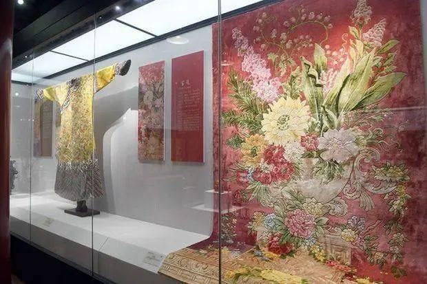 燕京八绝之一的京绣(左)和宫毯(右)作品展示
