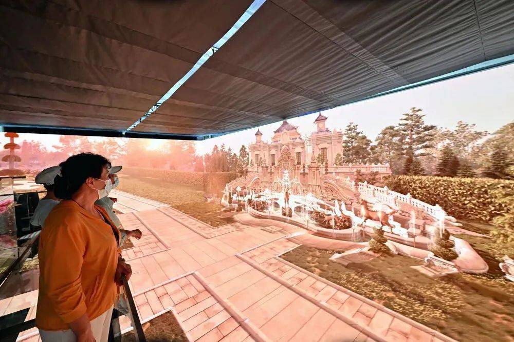参观者在2022年中国国际服务贸易交易会文旅服务专题展良业夜游展台的《千机圆明》沉浸体验空间内欣赏数字技术模拟的圆明园景象(2022年9月5日摄)。新华社记者 李鑫 /摄