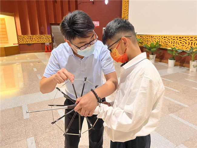 驻馆风筝传承人刘志江老师在研学大厅讲解了风筝的扎制、绘画等知识,现场传授了潍坊传统风筝制作基本技术要领。同学们在老师的指导下进行了风筝制作体验,完成了自己喜欢的风筝作品。