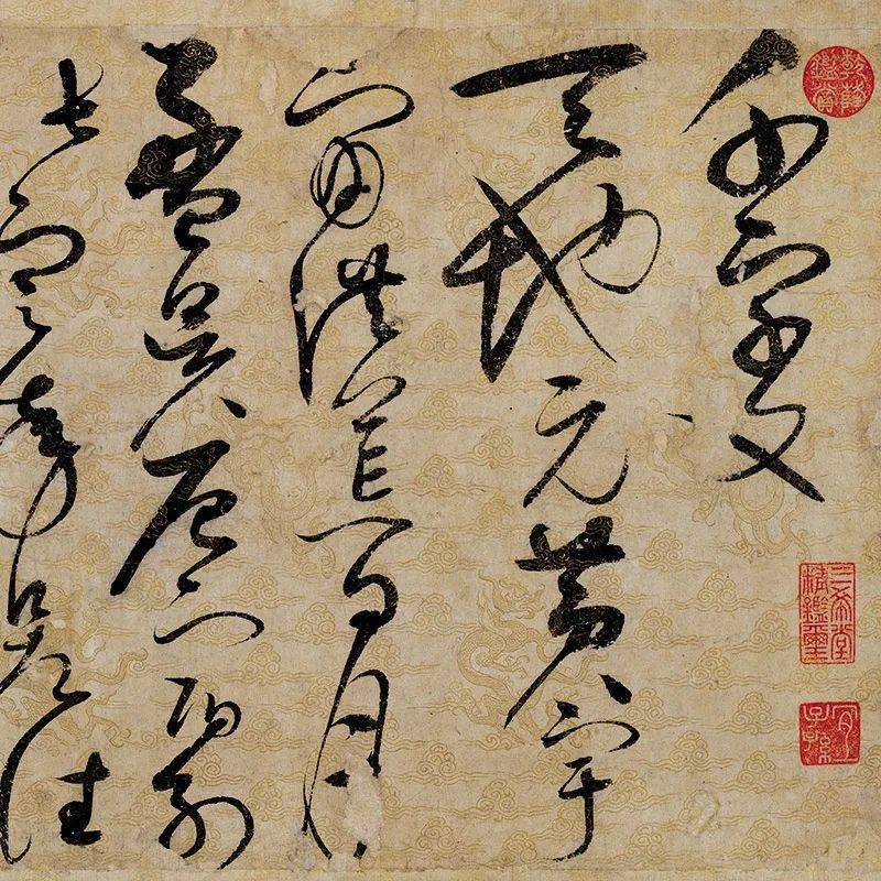 你们看,整幅作品是用草书中最为放纵的大草写成的,用笔十分奔放,与纸张上的云龙底纹相互映衬、相得益彰。书法生动而有气势,笔法连贯、一气呵成。大有“舍我其谁”的意味,颇具帝王风范呢!