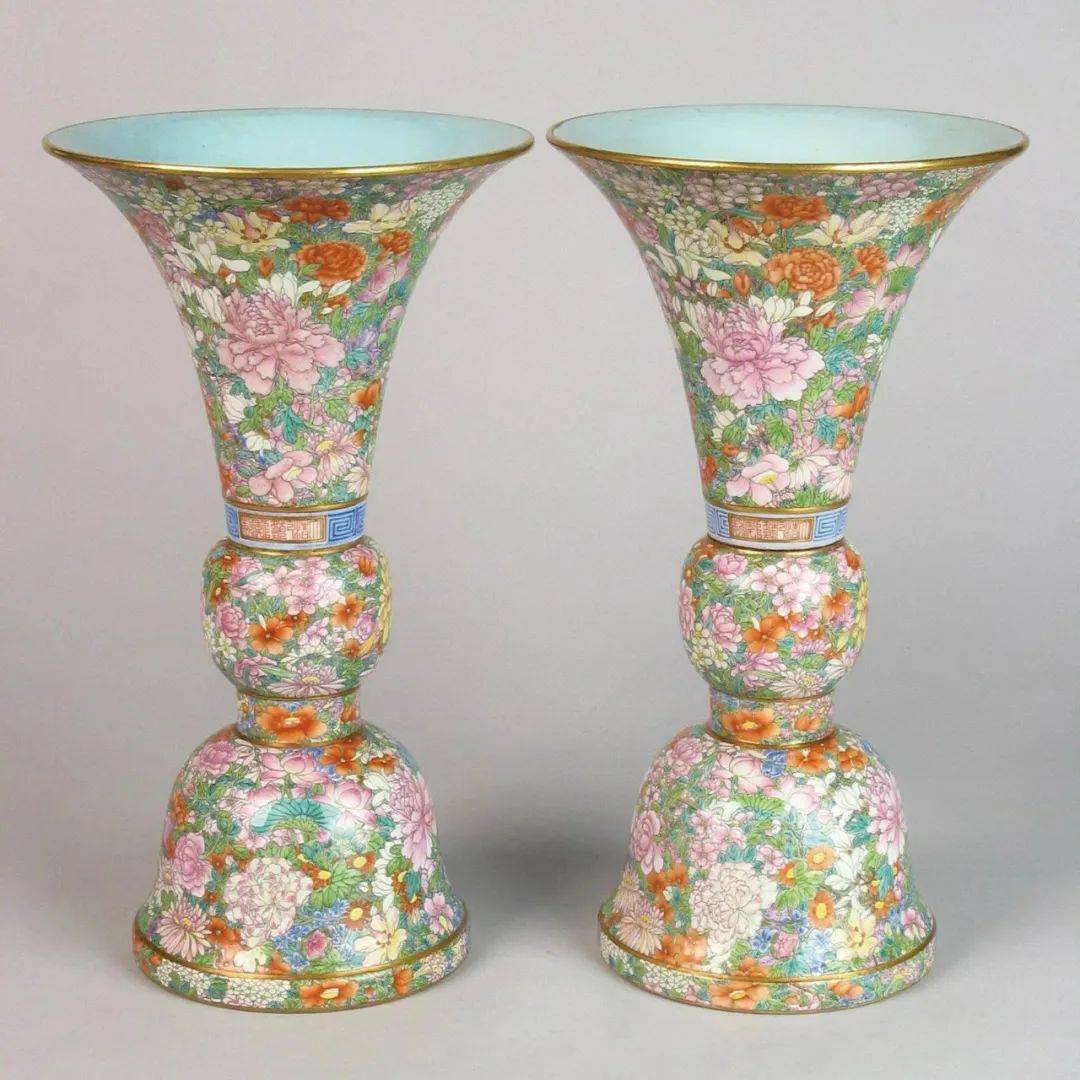像粉彩百花尊这类通体彩绘各式花样的瓷器也被称为“百花不露地”瓷器,也叫“百花不落地”,是瓷器釉上彩的一种表现手法,将粉彩与金彩结合,用花朵填满整个画面,不露出瓷底,也不露出花朵的枝干。百花如同天女散花,浮于空中,故称“百花不落地”,也叫“万花堆”。百花不落地瓷器烧制工序之繁缛,设色之丰富,绘画之多彩,可以称得上是彩瓷之翘首。