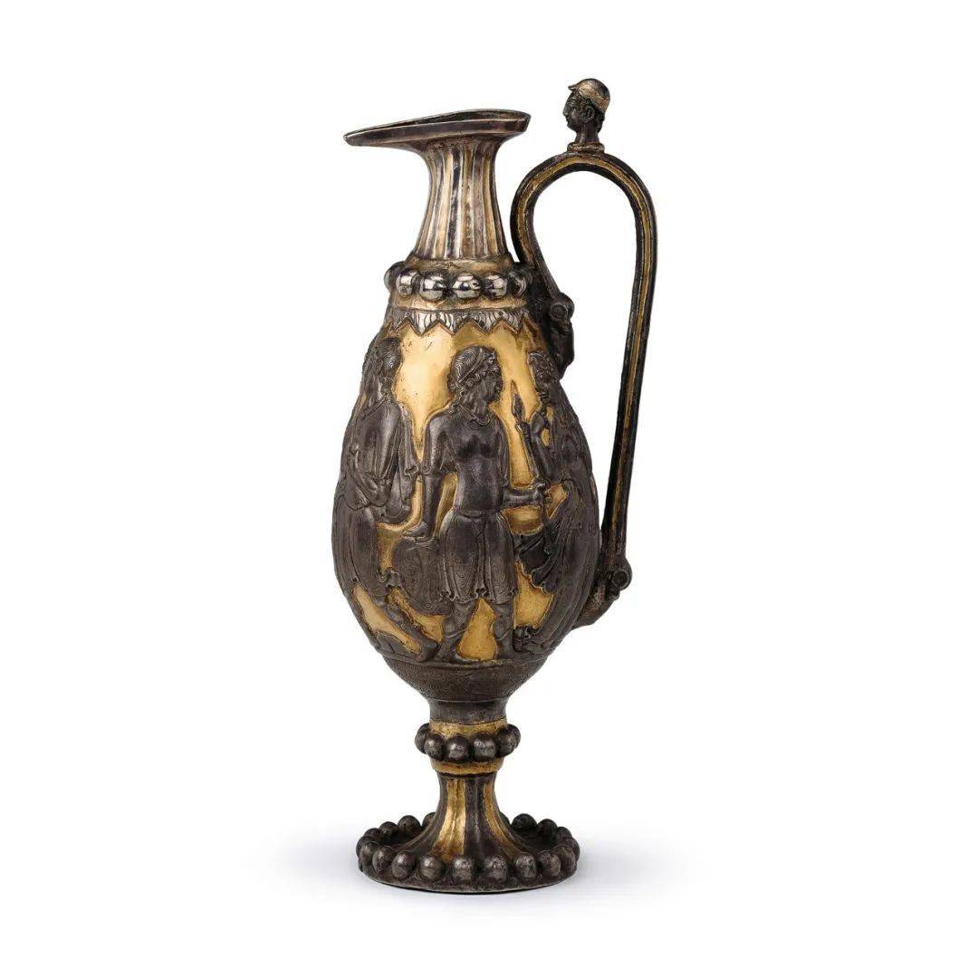 你看,壶身上有三处像小圆珠串起来的纹饰,将壶身切分为三段,这种就是来自波斯萨珊王朝的联珠纹,它传入中国后,对壁画和织锦艺术影响很大,我们常能在作品中见到它;在壶把儿的上方有一个高鼻深目的人头像,古希腊人认为这样可以保护壶中的酒水洁净,不被恶灵玷污;在壶的颈部、底部及壶把儿上有整齐的凹槽,这让我们联想到古希腊建筑中的廊柱,彰显着西方古典的秩序之美。要说最引人注目的,还是壶腹上刻画的人物故事了,仔细观察,我们会发现这些人物来源于古希腊神话《特洛伊》,女神阿芙洛狄忒、帕里斯王子、美女海伦等角色都在壶身上定格,演绎着属于自己的故事。鎏金银壶本是波斯王朝的酒具,而其上的纹饰当是工匠模拟希腊图像制作的。