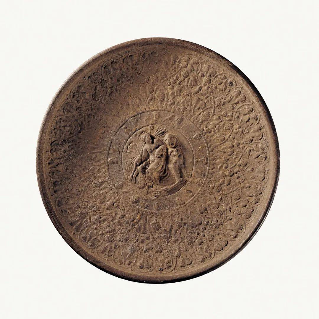 眼前的这件文物叫做东罗马鎏金银盘。光听名字就知道,这一定不是咱中国本土的物件。你不信吗?那让我们一起来鉴赏吧!这只鎏金银盘一看就不同寻常,虽然经过岁月的消磨,泥沙的侵蚀,鎏金已经大部分脱落了,但从银盘上满饰的一圈圈浮雕纹样就可以想象它当年的精美绝伦!上面满满浮雕的花纹没有一点中国特色,却充满了异域风情:盘内满饰浮雕花纹,纹饰分为三个区域。外圈饰葡萄卷草纹,其间栖有小鸟等小动物;中间一圈浮雕十二个人头像,每个头像左侧各有一只动物;盘中央为微微凸起的圆域,图案为一倚坐于狮豹类猛兽背部的青年男性,是银盘的主体花纹。盘子上有铭文,更多的研究者认为是大夏文。大夏文是大夏贵霜时代即已采用的希腊字母的草写本。