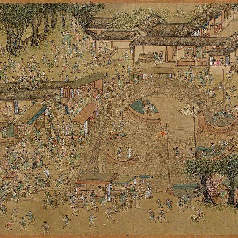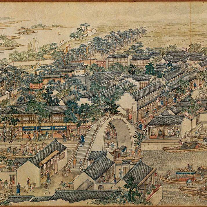 现在让我们来欣赏一下面前这件巨幅纸本画作吧!画家采用“散点透视”的方法,用流动的视角串联起画面。以青绿山水为主调,将兼工带写、界画技法、西洋透视法三种绘画技巧结合运用,突出了人物刻画,以精湛的写实技巧,生动传神地再现了清代苏州的人文风物。据不完全统计,全幅画描绘各色人物4800余人,房屋建筑2140余栋,桥梁50余座,船只400多条,商号招牌200余块,涵盖丝绸、乐器、钱庄等50多类行业,此外还有工坊市肆、舟船车轿、迎亲嫁娶、舞榭歌台、官衙考场等场景,真实记录了清代苏州古城的商业繁荣与市井风貌,好不热闹!不论身份地位、不论社会分工,置身姑苏,都能在和睦融洽的氛围中生活,这便是古人对“和而不同”社会观最生动的解读。