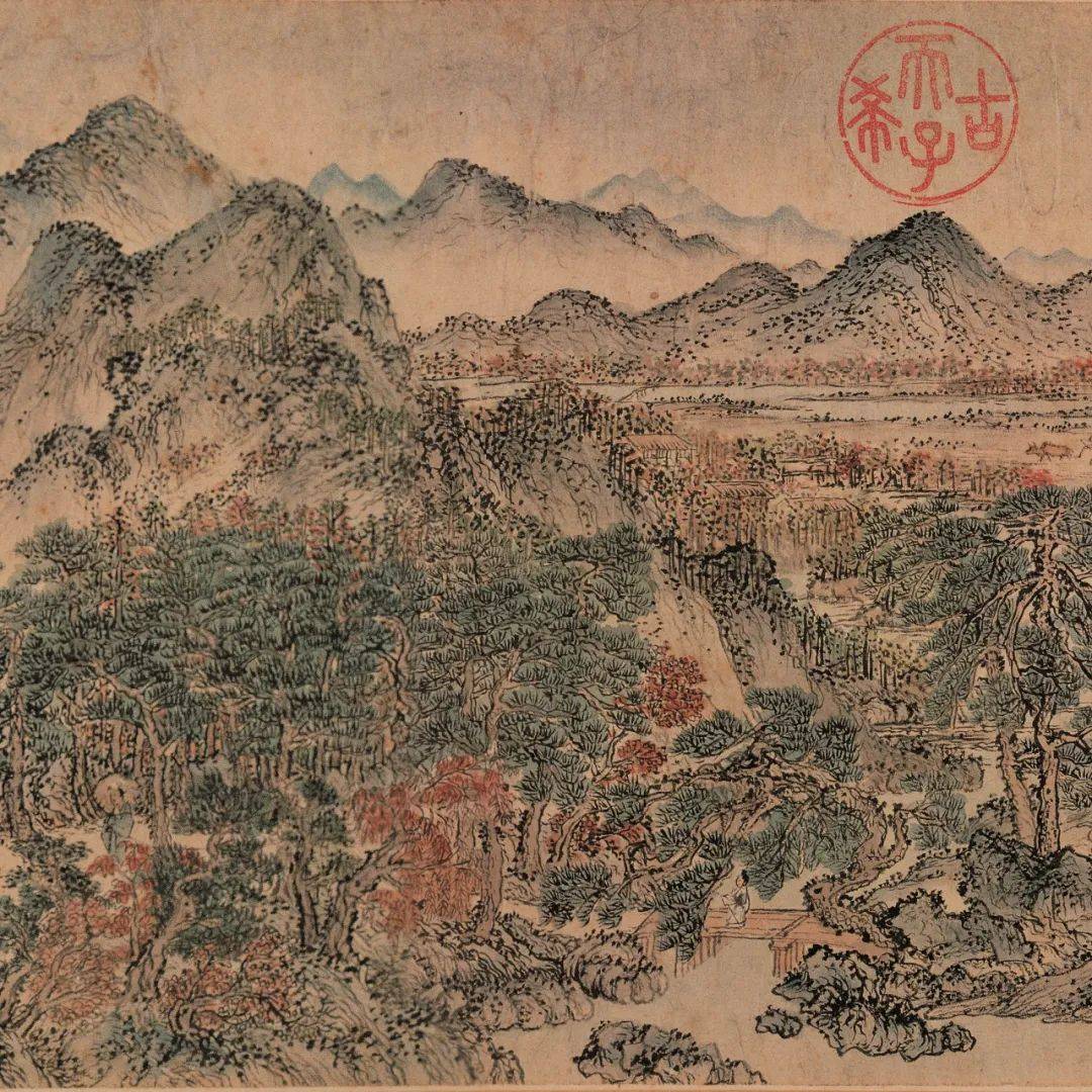《太白山图卷》描绘的是浙江太白山天童寺的景色,通过画面我们可以看到松林苍郁且茂密,其间还能隐约看到寺庙楼阁、草堂屋舍等建筑。松林之间有一条通往天童寺的小路,蜿蜒曲折,婉若游龙,往来游客行走在小路上,似在欣赏沿途的风景,十分惬意。远处山峦绵延,屋宇良田错落其间。画面着色较重,山青叶红对比明显,凸显了山间的田园秋景。画面最后绘出天童寺,你们看,古寺坐落于山谷之中,僧人悠游于松林庙宇之间,写实性较强,画面中的场景还能与现在的实景相对应呢!