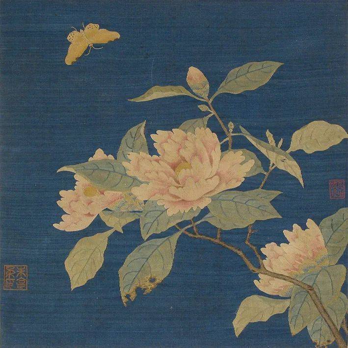 说起缂丝牡丹,就不得不提南宋缂丝名手朱克柔的作品,也就是面前的这幅佳作。让我们一起来欣赏一下吧!整幅作品以蓝色为底,其上盛开一朵由黄绿色茎叶衬托而出的牡丹,富丽娇艳,惹人注目。牡丹花朵饱满端庄,四周叶片扬招于阳光下,叶片上斑驳错落留有花朵的影子,显得花色更加明媚,硕大而立体;牡丹的花叶也是千姿百态,如娇娥之手,捧托呵护。左下角还缂有“朱克柔印”。整幅画面均以长短戗等多种缂织技法织就,牡丹花瓣和花叶用同一色系,却深浅不同的颜色相互穿插缂织,显现出自然晕色的效果,宛如一朵鲜活的牡丹坐拥无限风光。