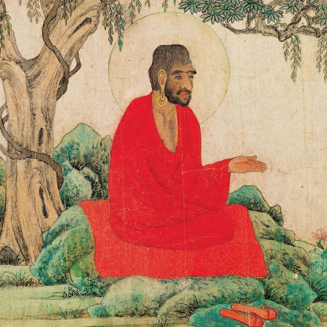 你们看!图中身着红色袈裟的西域僧盘腿坐于大树下面的青石之上。此僧浓眉深眼,大鼻隆突,胡须络腮,肤色黝黑,从其外貌特征观察就知道他不是中原僧人,而是来自西域。它的目光深邃,面容慈祥,神态安详坚毅,左手向前平伸,掌心向上,右手抱入红衣之内,似在说法布道。而头后有光环,则显示此僧已经得道修成,是一个了脱生死的罗汉了。因此这幅画也被称为《红衣罗汉图》。