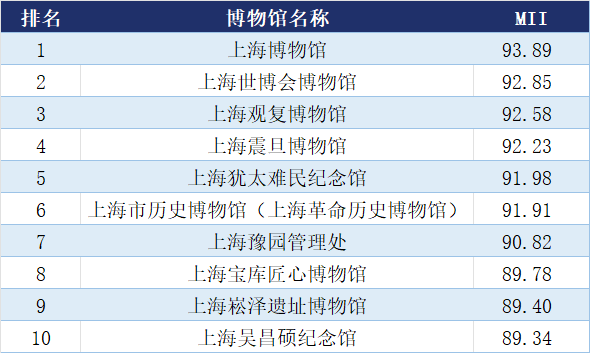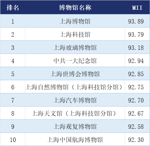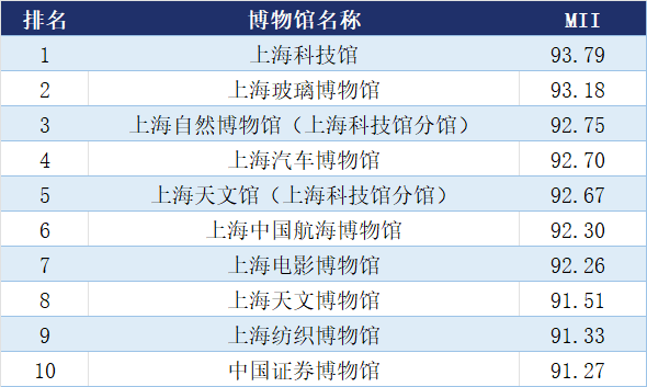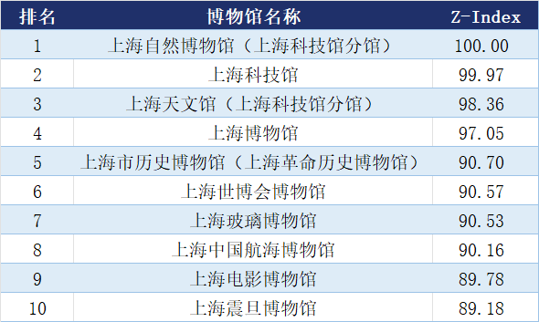 从综合排名看,上海博物馆与上海科技馆优势依旧明显。两馆在知名度、传播度、参与度、融合度等单项排名中名列前茅,是上海地区的代表性博物馆。