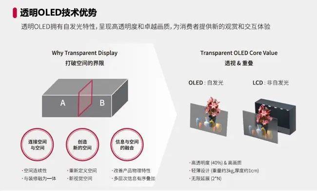 那么,什么是透明OLED呢?简单来说,这是一种能实现40%透明度的新型显示屏,厚度不到1mm,可以附着在玻璃上,把整块玻璃做成透明屏幕。在不影响观看玻璃背后展品的前提下,透明OLED屏幕还能呈现图文、视频等内容播放,并实现触摸、AR等互动效果。