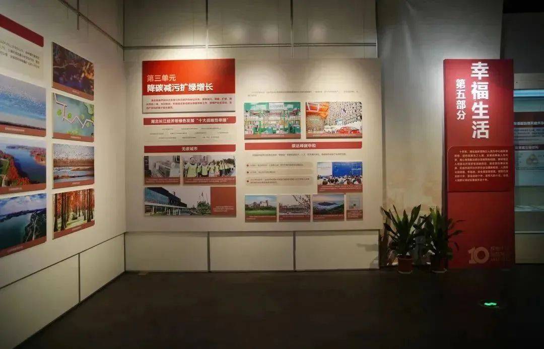 展示了十年来,湖北坚持共抓大保护、不搞大开发,始终把修复长江生态环境摆在压倒性位置,坚持“绿水青山就是金山银山”,坚决走生态优先、绿色发展之路,打好污染防治攻坚战,减污降碳协同增效,着力推动高水平保护和高质量发展互促共进,长江生态环境发生了“河畅水清、岸绿景美”的明显变化。长江干流湖北段水质保持在Ⅱ类,河湖断面水质优良比例达到93.7%,空气质量优良天数比例达到86.7%,森林覆盖率达到42%。今天的湖北,天更蓝、地更绿、水更清,展现了“千湖之省、鱼米之乡”的生态美景。