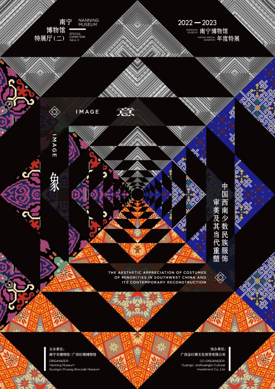 “意象——中国西南少数民族服饰审美及其当代重塑”展是南宁市博物馆精心打造的原创艺术展。展名“意象”,取自中国传统美学中“美在意象”的观点。展览分为“天·人”“象·意”“约·繁”“常·易”四个部分,通过甄选的65件(套)民族服饰以及各民族制作服饰的原料器具,展示少数民族“各美其美、美美与共”的美学意蕴,探索少数民族文化交流与融合的可能性,讨论民族美学与现代审美的关联,启发更多的人在弘扬民族美学的道路上守正创新,为铸牢中华民族共同体意识、赓续民族文化血脉、提振文化自信注入强大力量!
