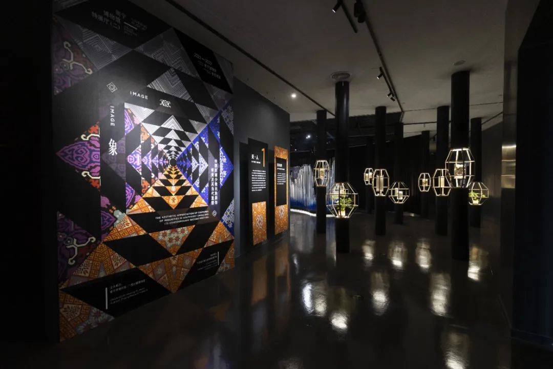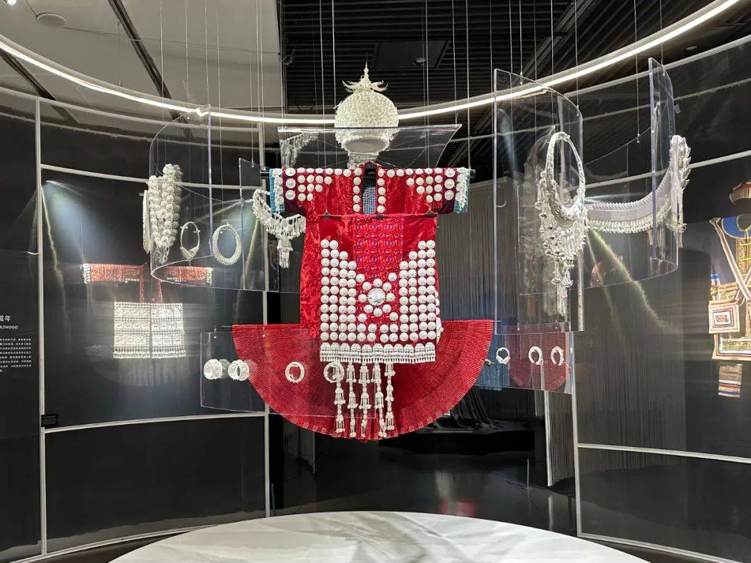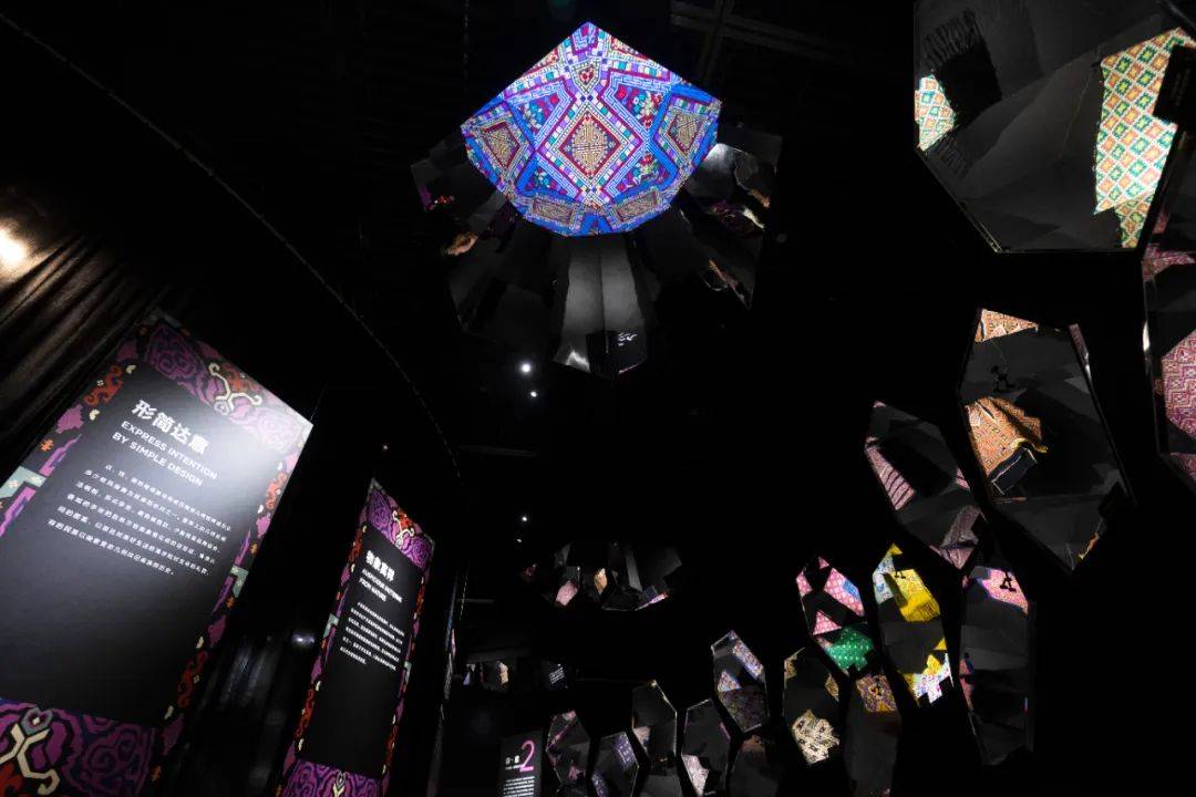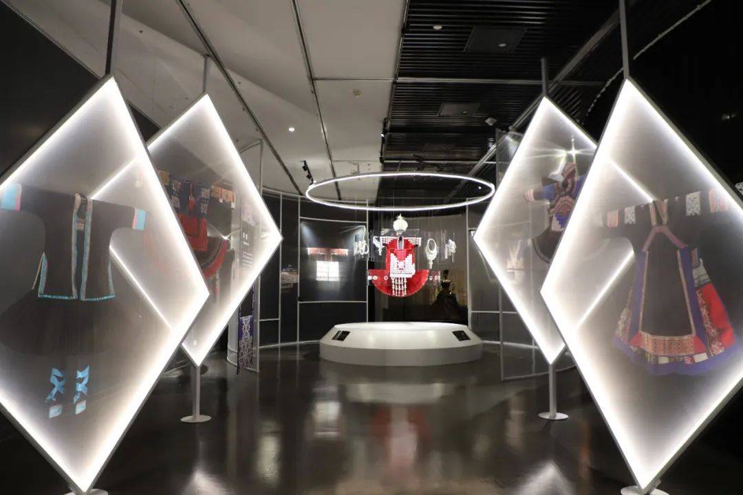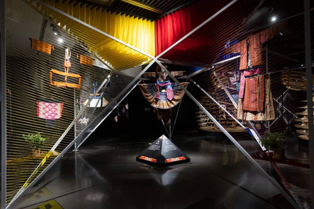 以两组渐进式高低错落的菱形装置,对比呈现西南少数民族服饰色彩之“素·华”、款式之“和·合”,尽显民族服饰的和谐之美。“时·变”则阐释人在初生、成年、婚嫁、节庆、暮年等各个阶段,服饰随着角色变化而演化。环形的布局和逐渐升高的展品,象征着一代又一代人的循环与轮回。